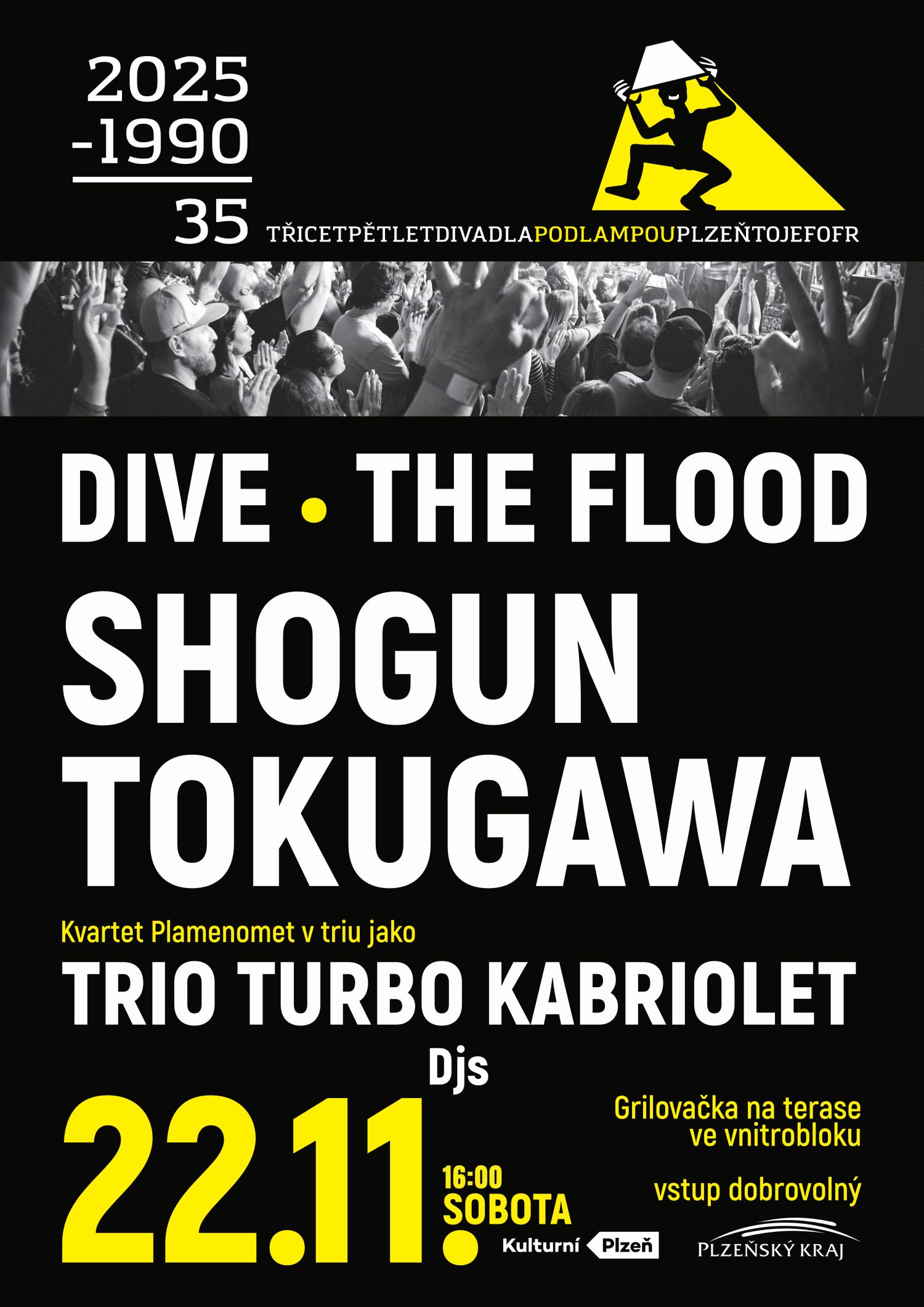 Můžete se těšit na exkluzivní sety legendárních Dive a Shogun Tokugawa, jediné vystoupení tříčlenné varianty skupiny Kvartet Plamenomet pod názvem Trio Turbo Kabriolet a nadějnou plzeňskou indie alternativu The Flood.