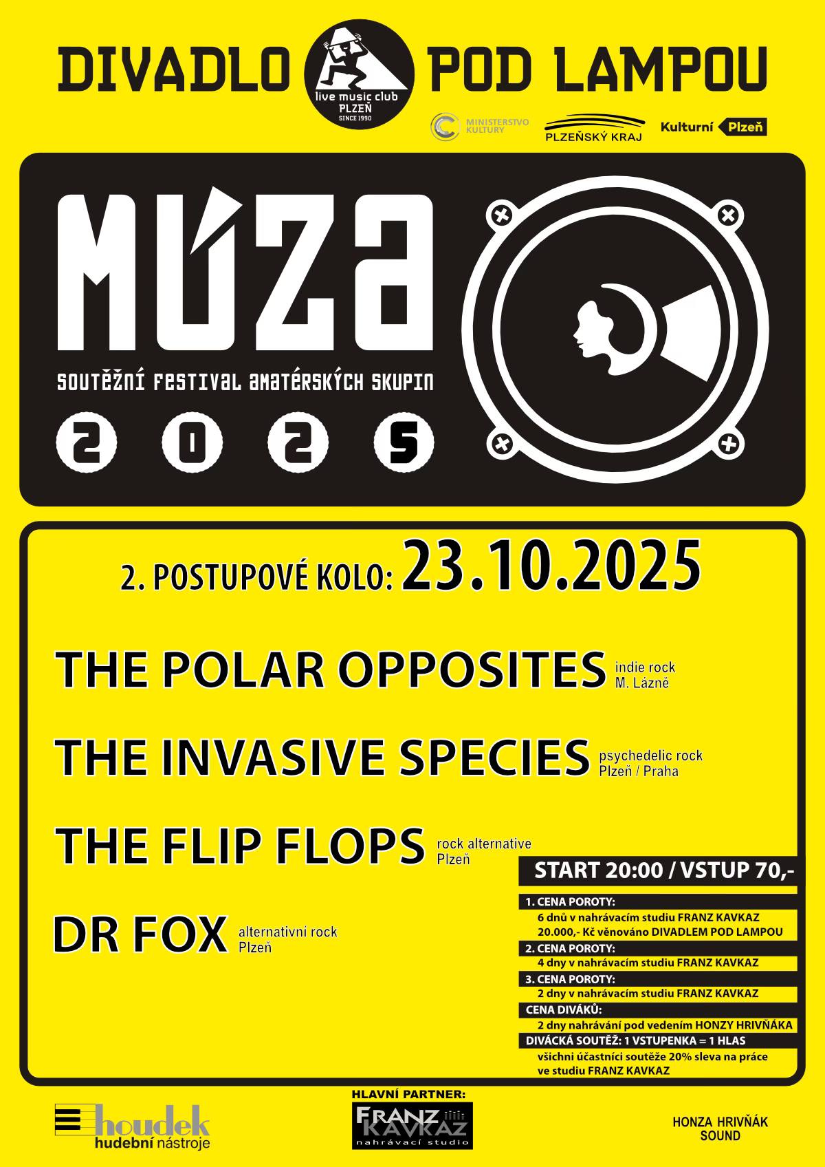 THe POLAR OPPOSITES – indie rock / M. Lázně THE INVASIVE SPECIES – psychedelic rock / Plzeň-Praha THE FLIP FLOPS – rock alternatrive / plzeň DR. FOX – alternativní rock / Plzeň